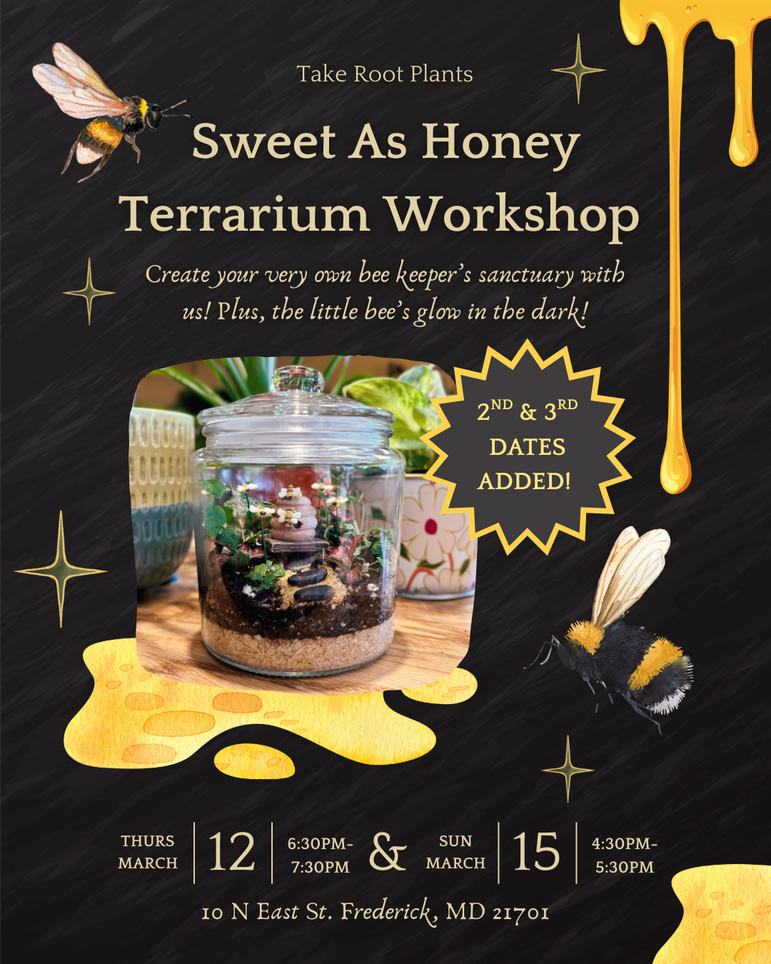 Join us for our Sweet As Honey Terrarium Workshop, being held at our shop on Thursday, March 12th from 6:30pm-7:30pm!