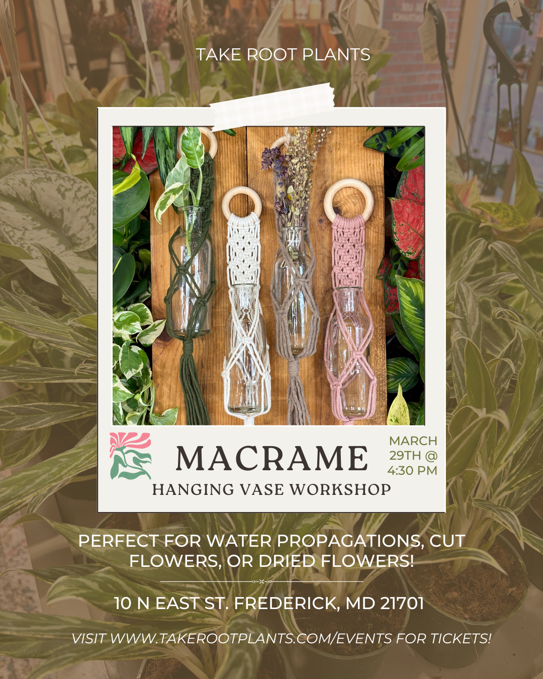 Take Root 10 N East St., Frederick, United StatesLearn how to make a beginner friendly Macrame Hanging Vase with Fran on Sunday, March 29th at the shop! In this class, you will be working with cotton cord to […]